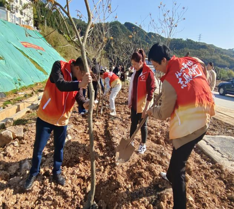 春風(fēng)拂綠,春意盎然?;顒蝇F(xiàn)場,黨員們熱情高漲,干勁十足。揮鍬鏟土、扶苗填坑、培土壓實(shí)、圍堰澆水,整個(gè)過程,各個(gè)環(huán)節(jié)都銜接有序,每道步驟都一絲不茍,大家分工明確,配合默契。在共建單位的共同努力下,一排排黃花風(fēng)鈴木樹苗在荒坡上“安家落戶”,迎風(fēng)挺立,展現(xiàn)出勃勃生機(jī)。